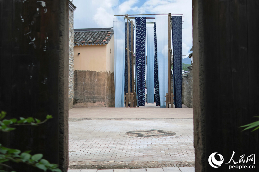 染坊悬挂晾晒的扎染作品。人民网 李昌乾摄