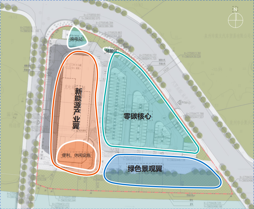 泉州市新能源汽贸城(B13地块)零碳驿站项目,总投资5000万元,用地面积约17.26亩。项目位于霞美镇汽贸城核心区域,作为泉州市同城化战略的关键拼图和首批“泉州市特色商业街区”的重要组成部分,旨在打造集光伏发电、储能、充电、检测、换电五大功能于一体的新能源综合服务体及商贸中心。